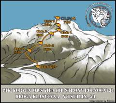 DROGA: Szczyt zamierzam zdobywać, aklimatyzując się na drodze Brodkina, która doczekała się pierwszego przejścia w 1968 roku. Wiedzie ona przez lodowiec Waltera, następnie granią Borodkina na Pamirskie Plateau, następnie przełęcz Duszanbe i Komunizmu.